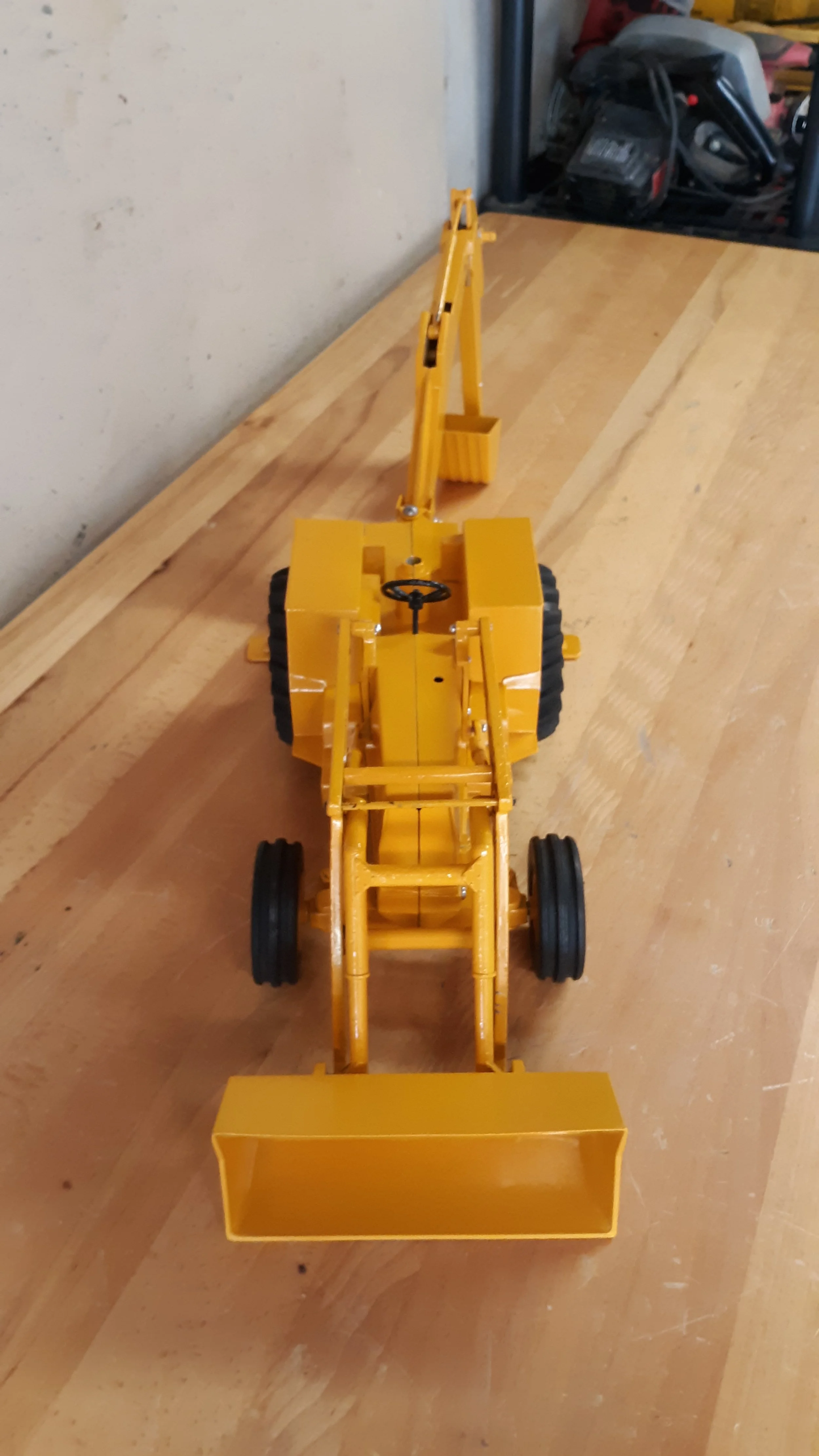 This was mine when I was a child. This Ford backhoe withstood years of use and abuse playing in the dirt. The front right wheel broke off and it went into the basement for 20 years. One day I rescued it from its neglected state and gave it some much needed attention. I restored it back to it’s original beauty in Caterpillar Yellow. Am very happy to have this gem from childhood looking new again!